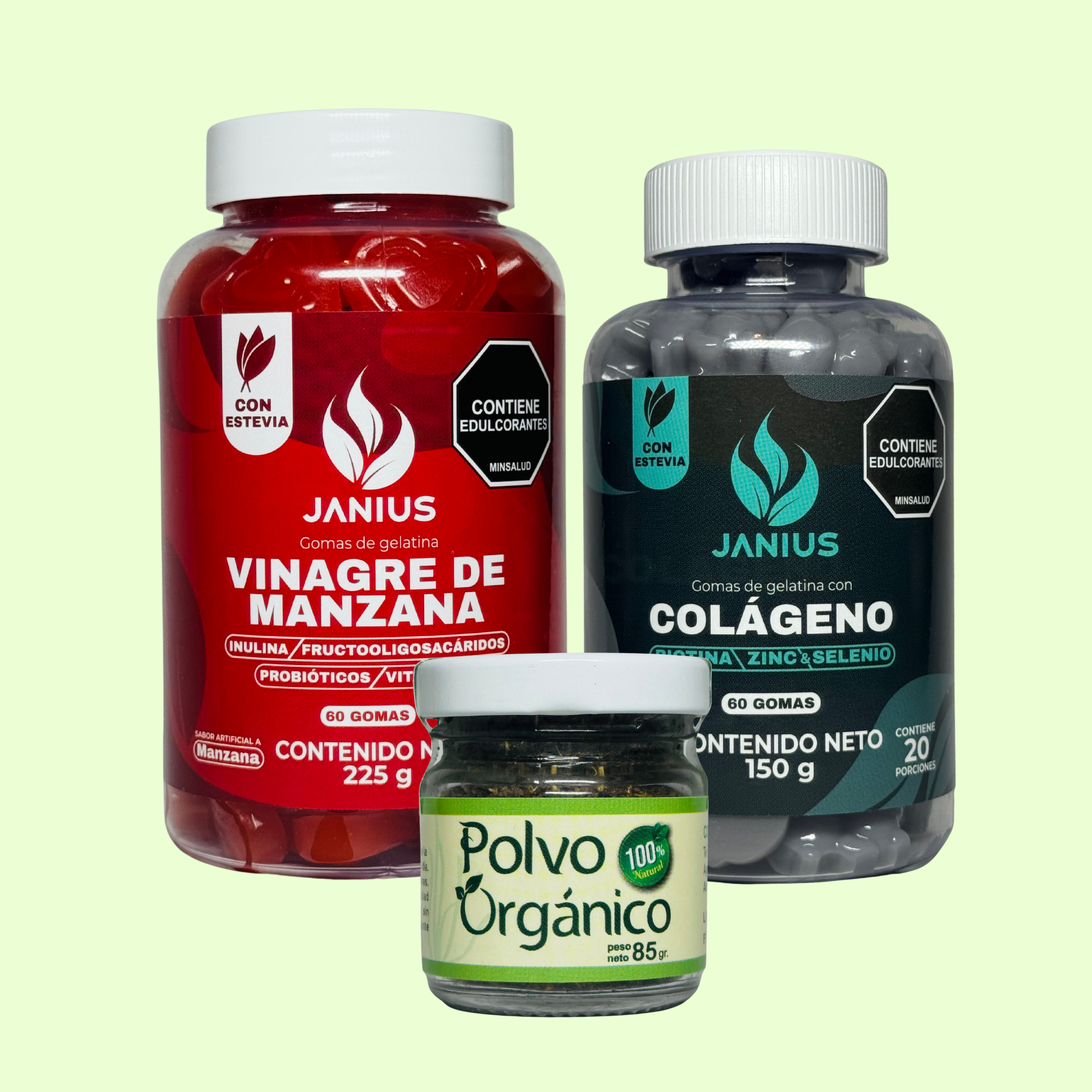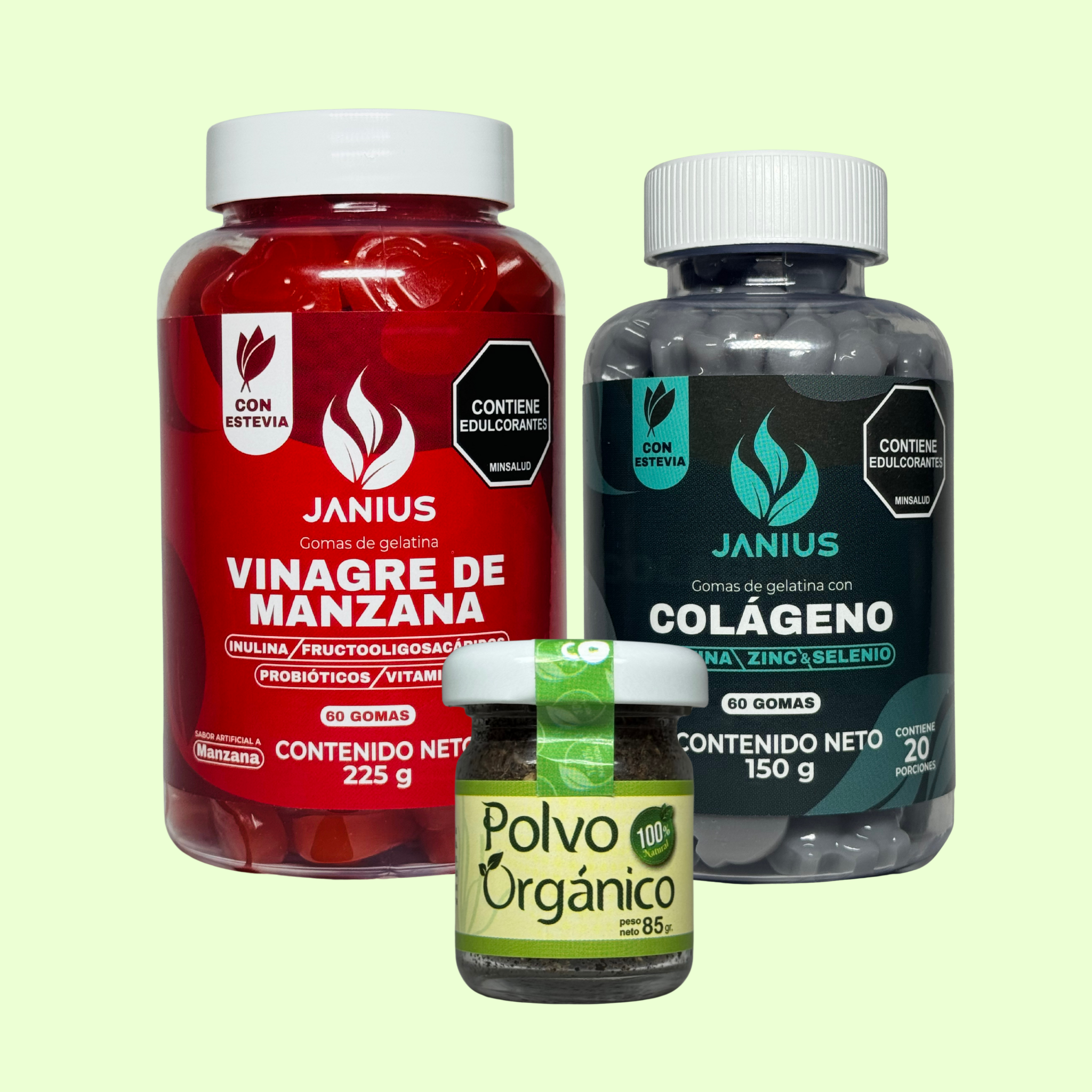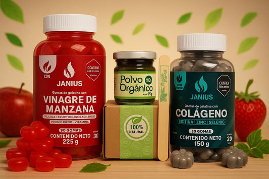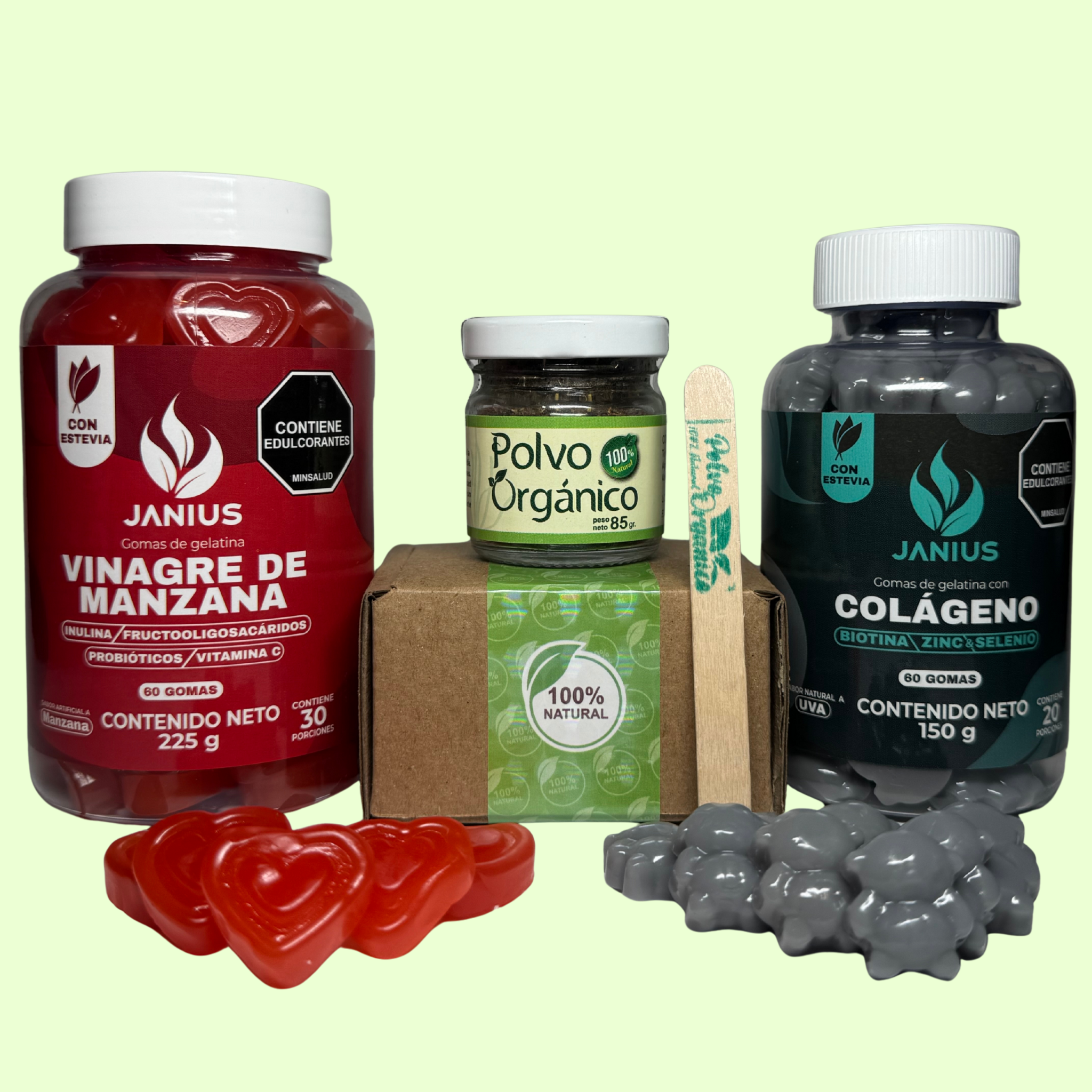 Mientras el Polvo Orgánico acelera tu metabolismo y favorece la quema de grasa, las Gomas de Vinagre de Manzana regulan el azúcar en sangre y mejoran la digestión; al mismo tiempo, las Gomas de Colágeno aportan nutrientes que fortalecen cabello y uñas, revitalizan la piel y refuerzan tu sistema inmune.